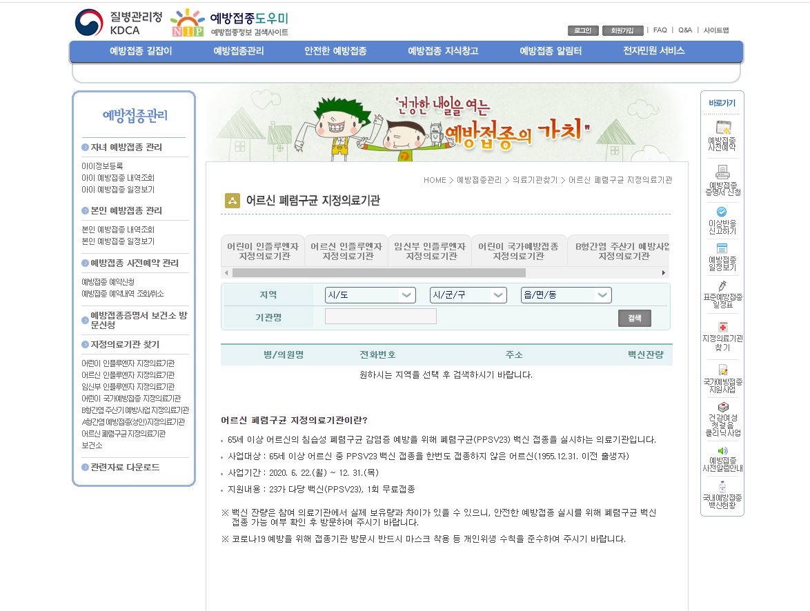 어르신분들은 위와 같은 탭으로 이동하신 후 중간에 스크롤을 마지막에 어르신 폐렴구균 지정 의료기관이 있으니 지역으로 검색하셔서 이용하시면 될 것 같습니다.