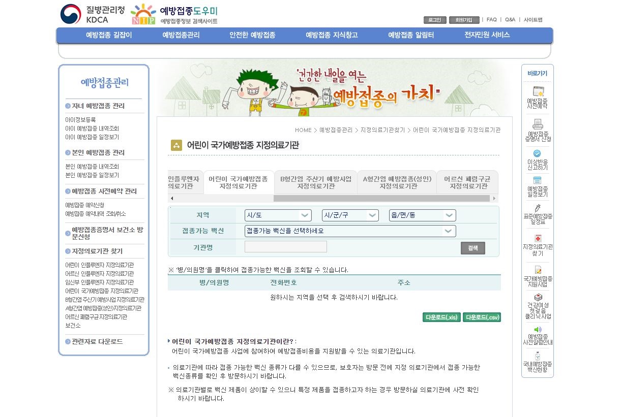 어린이는 사이트 상단 탭 예방접종관리 탭에 지정 의료기관 찾기 후 어린이 국가 예방접종 지정 의료기관에서 지역과 접종 가능 백신을 고르시면 무료로 접종할 수 있는 백신들이 나오니 확인하시면 될 것 같아요.