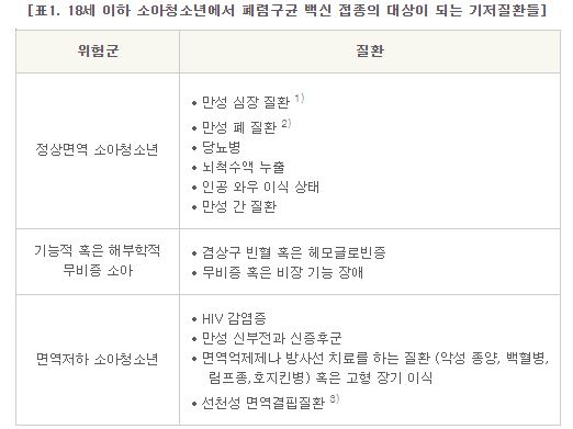3) 기능적 혹은 해부학적 무비증 환자나 면역 저하자는 1차 다당 백신 접종으로부터 5년이 경과한 후 2차 다당 백신 접종이 권장됨