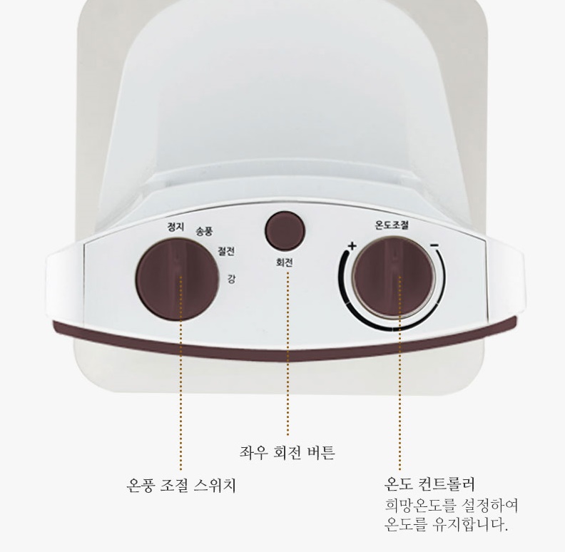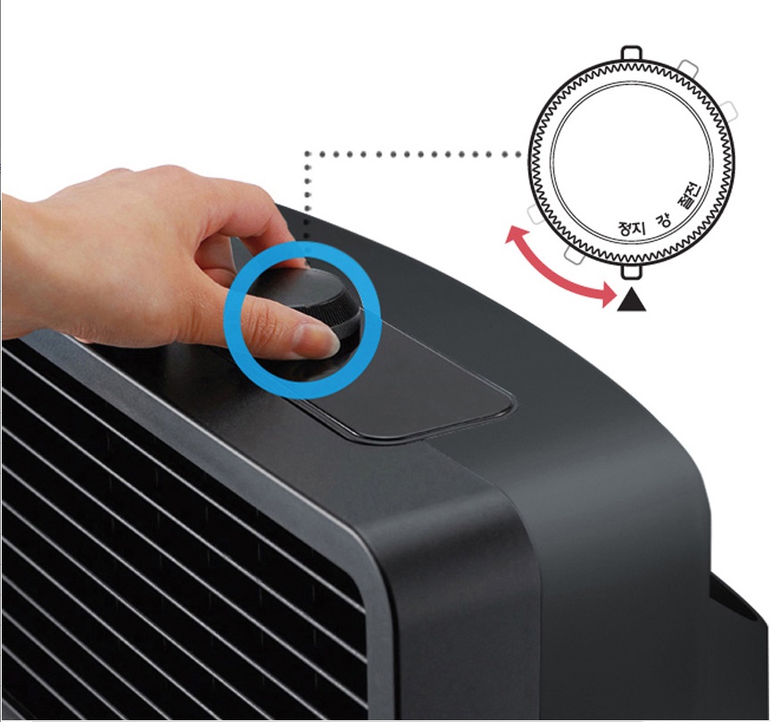 온풍을 사용할 때 현재 온도 지점보다 +방향으로 높게 희망온도를 설정하고, 설정된 희망온도 시점에 도달 시 자동으로 전원이 꺼졌다가 희망온도보다 온도가 떨어지면 재동작하는 스마트 제품입니다.