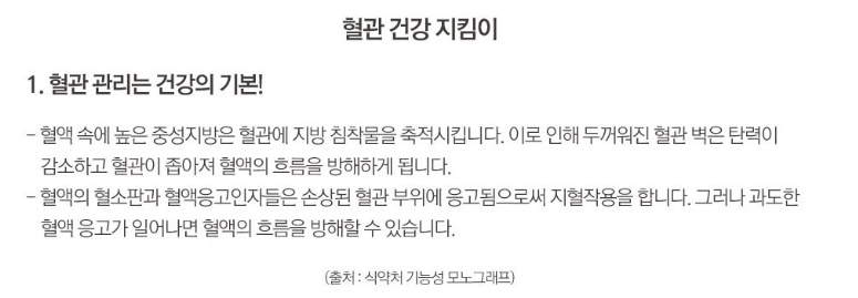 원활한 혈액의 흐름과 건강한 혈액을 위해 오메가 3을 섭취하게 되는데요. 오메가 3에 포함된 EPA 및 DHA 함유유지는 혈중 중성지질 개선에 도움을 줄 수 있으며, 혈행 개선에 도움을 줄 수가 있어요.