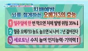 오메가3에는 우리 몸속에 DHA 수치가 낮으면 알츠하이머 즉 치매의 위험요인이 높아지는데요. 오메가 3은 인지장애를 예방하며 치료하는데 도움이 될 수 있다고 합니다.